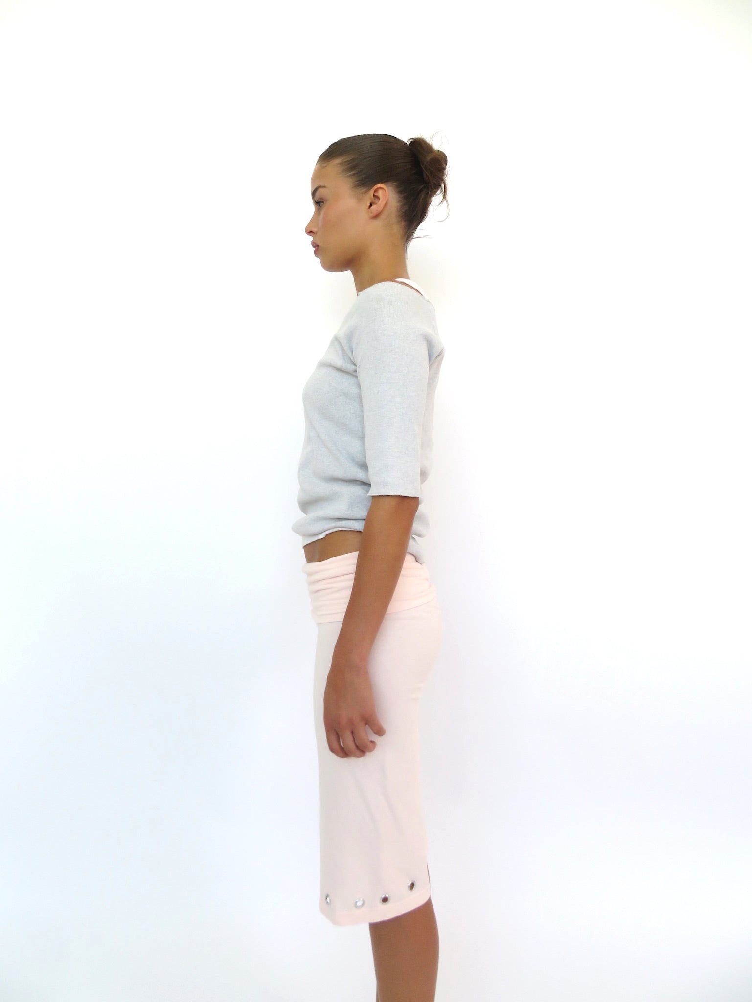 Fold down capri with eyelet detailing around the leg. Pale pink color.